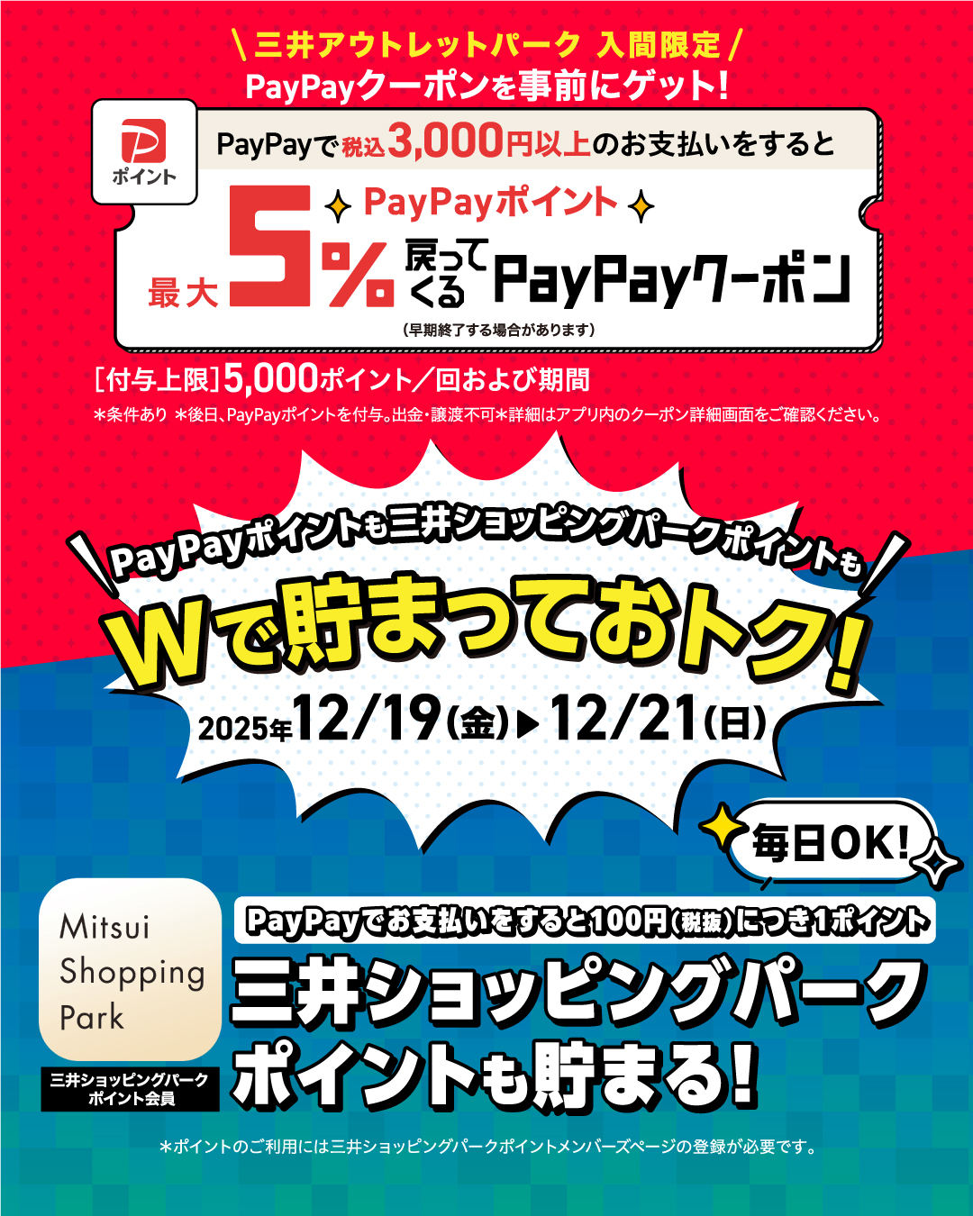 三井アウトレットパーク入間では、12/19(金)~21(日)の3日間、『PayPayで税込3,000円以上のお支払いをするとPayPayポイント最大5%戻ってくるPayPayクーポン』を実施いたします
