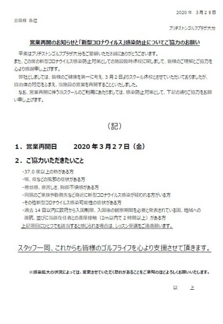 平素はブリヂストンゴルフプラザ大分をご愛顧いただき誠にありがとうございます。