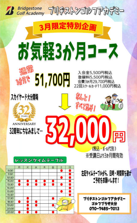 『お気軽3か月コース』を…スカイヤード大分開場32周年にちなんで