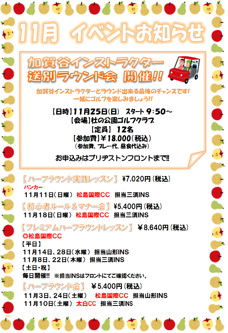 【訂正部分】 ◎月間予定表 11月5日(土)→ 11月3日(土) ◎イベントお知らせ 【ハーフラウンド会】 11月5日、24日(土)山形INS →11月3日、24日(土)山形INS