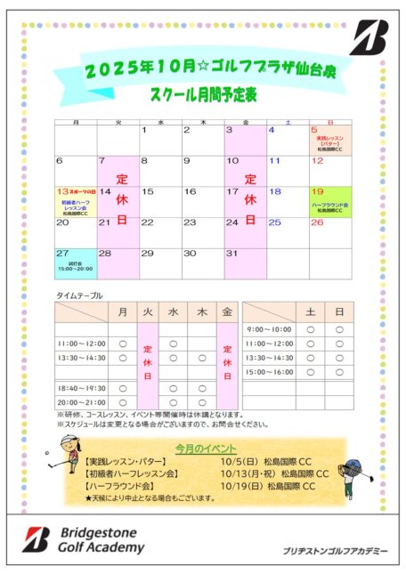 ブリヂストンゴルフプラザ仙台泉ではスクール生募集中です!ゴルフを始めたいけどどうしたらいいかわからない、レベルアップをしたい…等々。ゴルフを頑張るみなさま、まずは体験レッスンからご参加ください